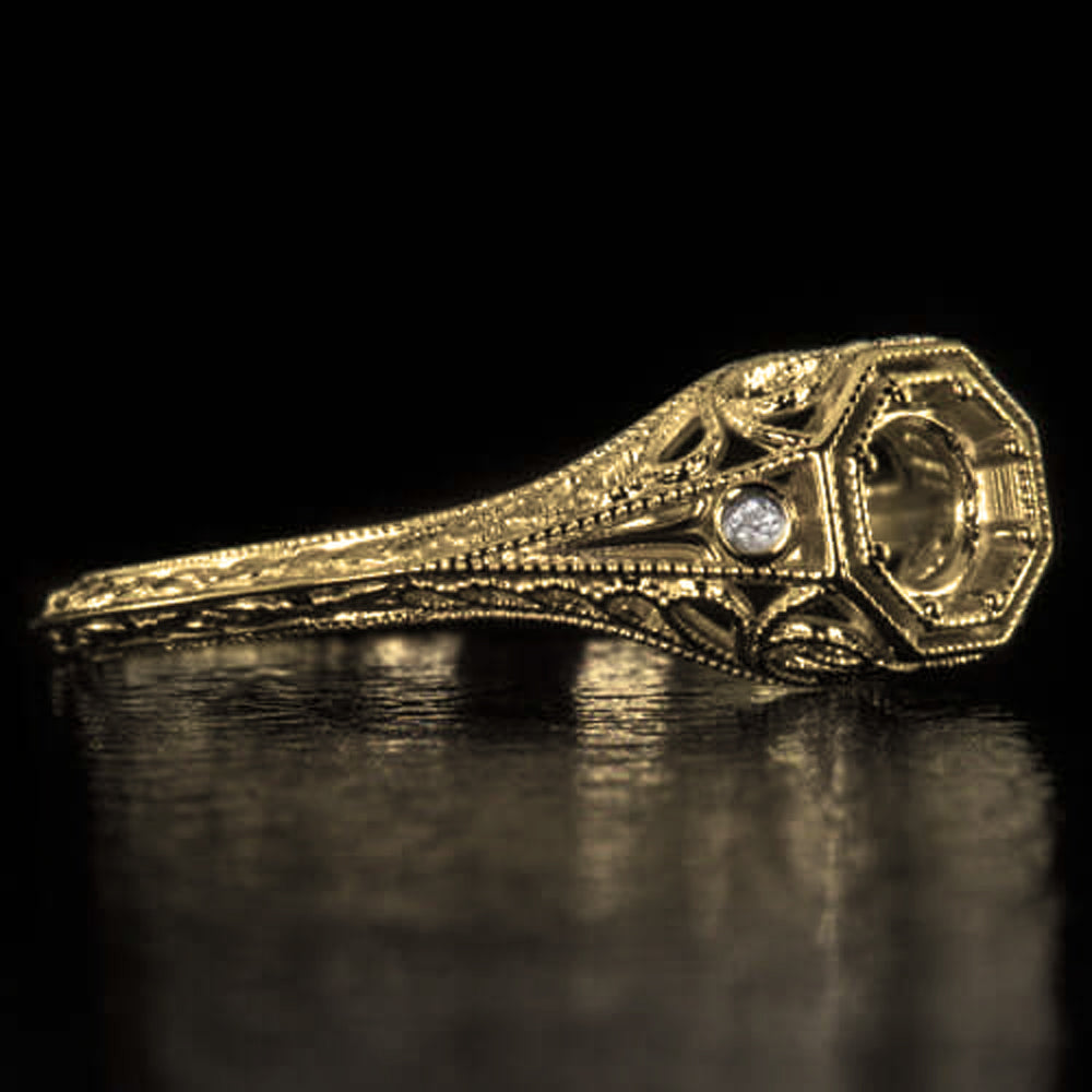 This vintage style setting offers a classically romantic backdrop for a center stone of your choice! It is richly crafted with delicate filigree details, floral engraving, and fine milgrain accents.